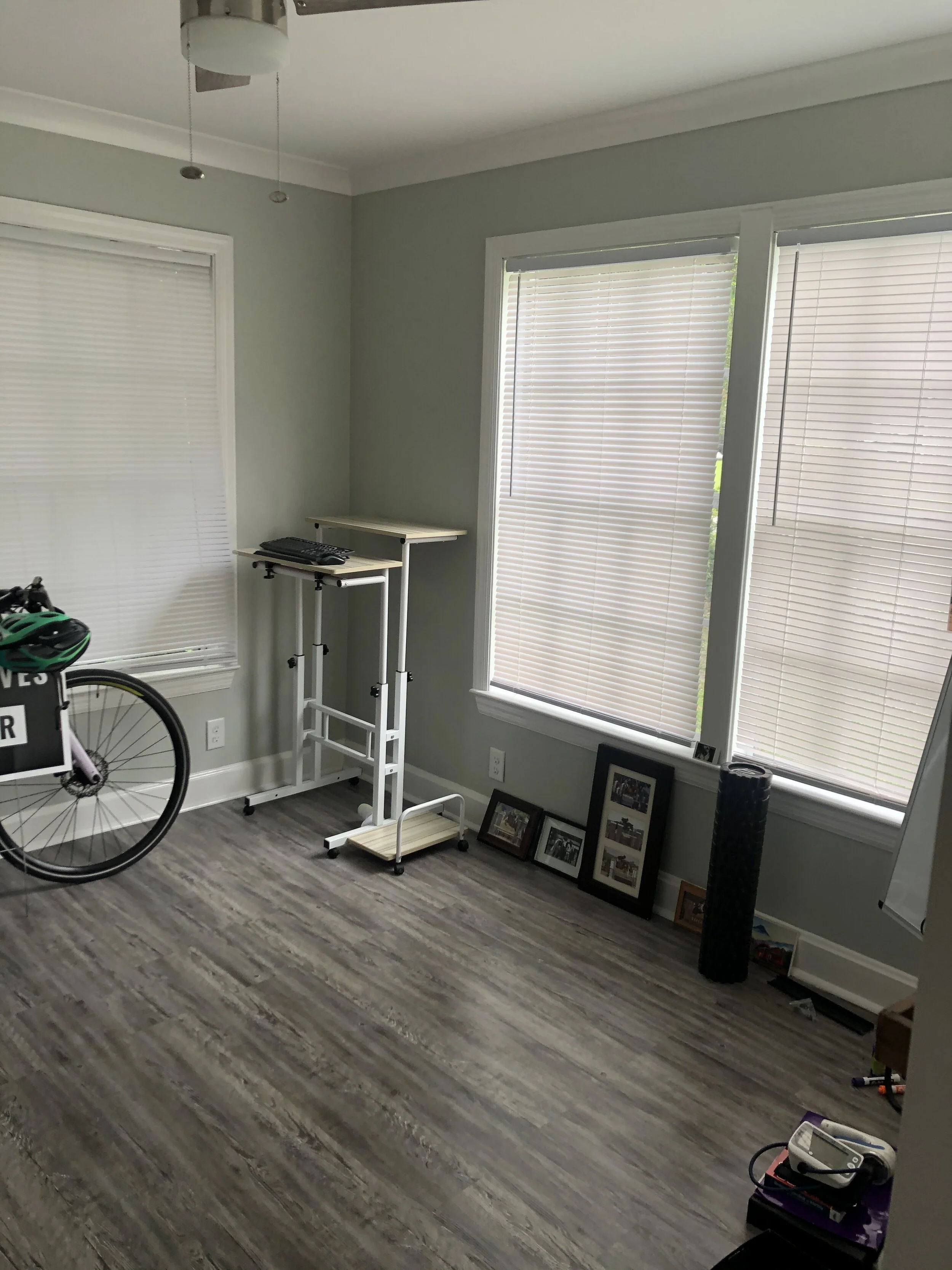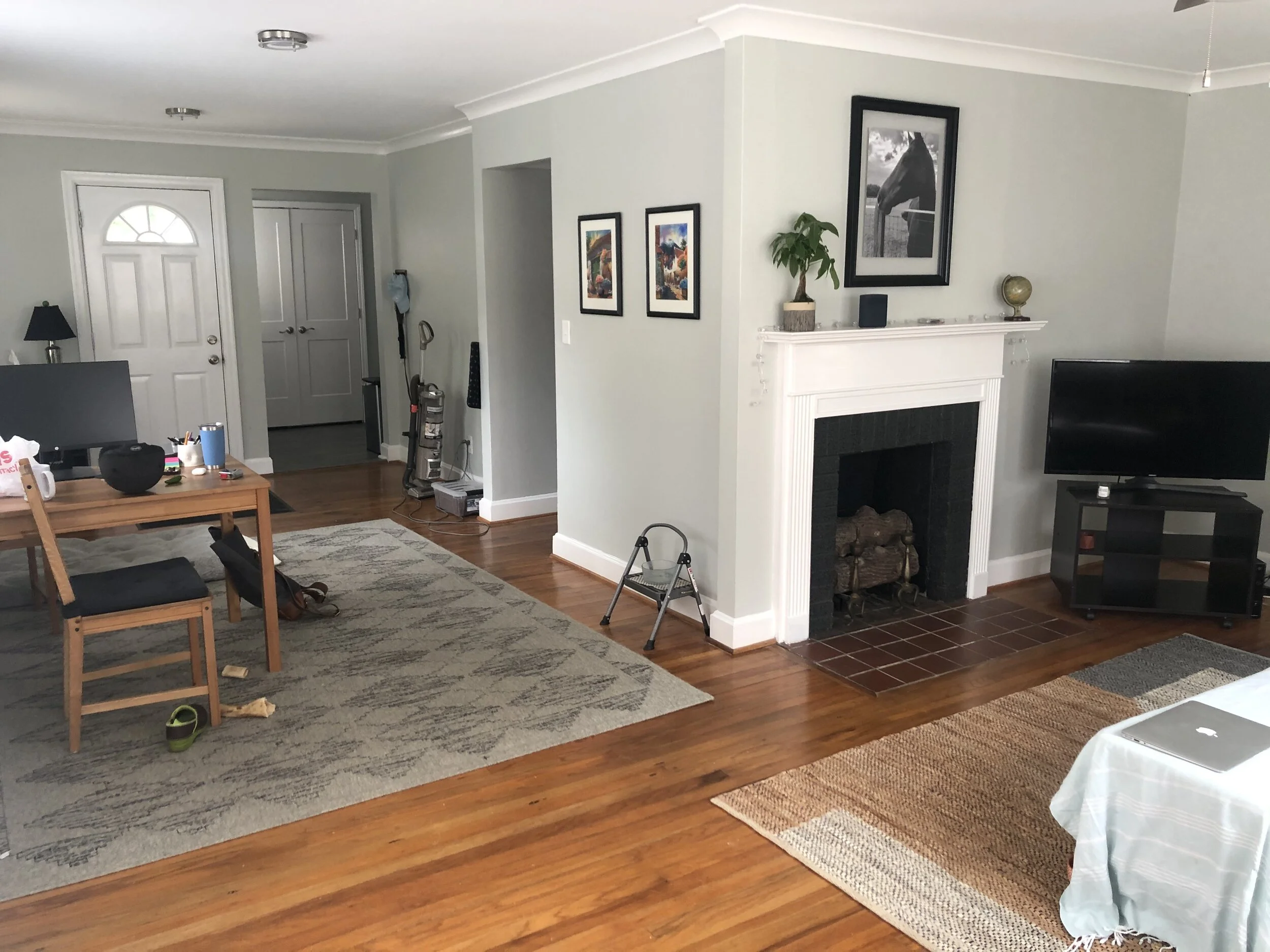 My friend originally had the sofa and television in the room right as you walk in the front door of this L-shape living room, where the fireplace is located. Since the fireplace did not work and there was not an ideal space for the television, I moved the sofa and television to the other end of the room, which, though smaller, provided a cozier space to cuddle up for a movie and a perfect wall to mount a TV. The fireplace corner now houses that teak credenza for storage and eye-catching art work and the opposite end of this space (which has great light!) will be the dining area.