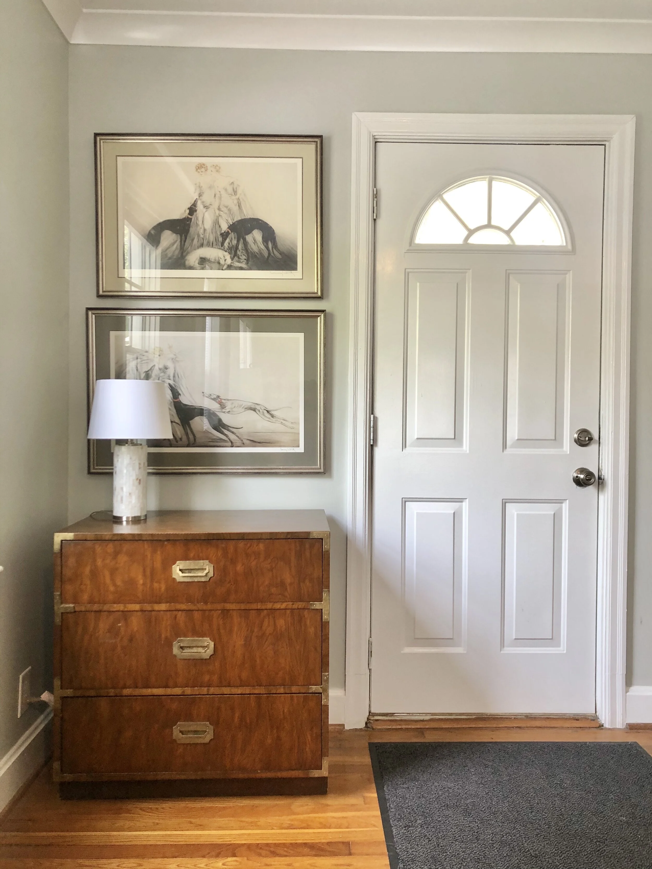 I recently flew down to Mobile, Alabama to visit one of my best friends, and, of course, do some design work! She had recently moved from Minneapolis to Alabama and wanted help designing achieving a “cowboy chic” look in her new bungalow. Her existing leather sofa and gray Aztec-style rug were our starting points. After I arrived, I walked around her house to get to know the space and flow, and scribbled down a furniture layout a couple of hours later. The next day, off we went! We hit some estate sales, antique shops and furniture stores and came home with a mixture of vintage and new finds to incorporate into her main living space. We found several key pieces at Antiques At The Loop (a MUST-visit!) including the teak credenza, brass and wood wall shelf, the distressed wood television console, mid-century campaign chest and the fabulous geometric pair of lamps. The pair of greyhound prints came from an estate sale and the rest came from various furniture shops in the area.